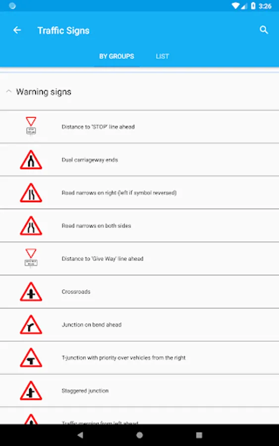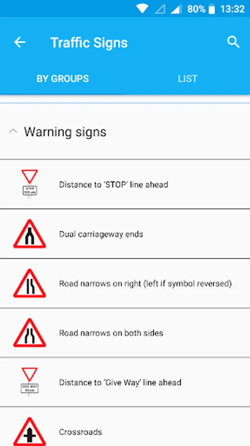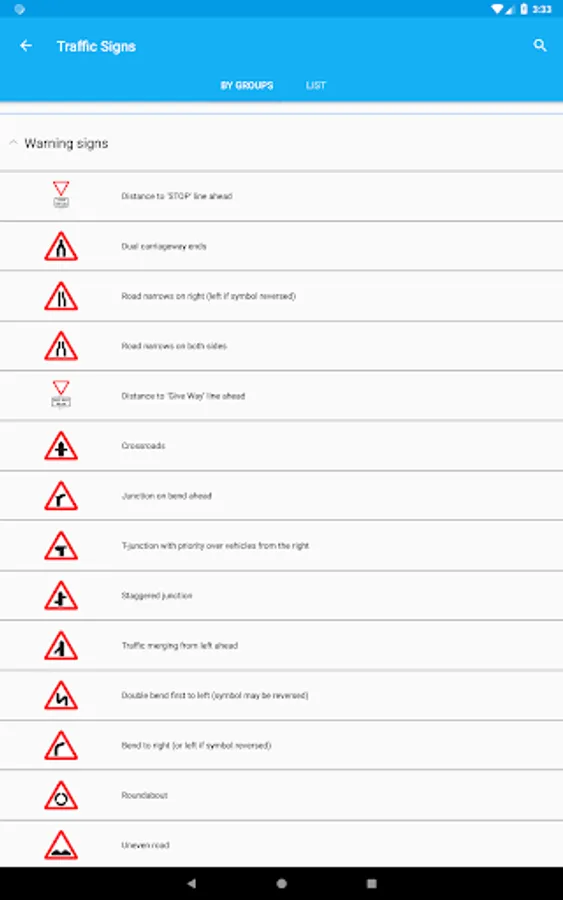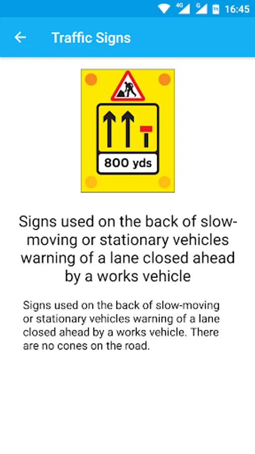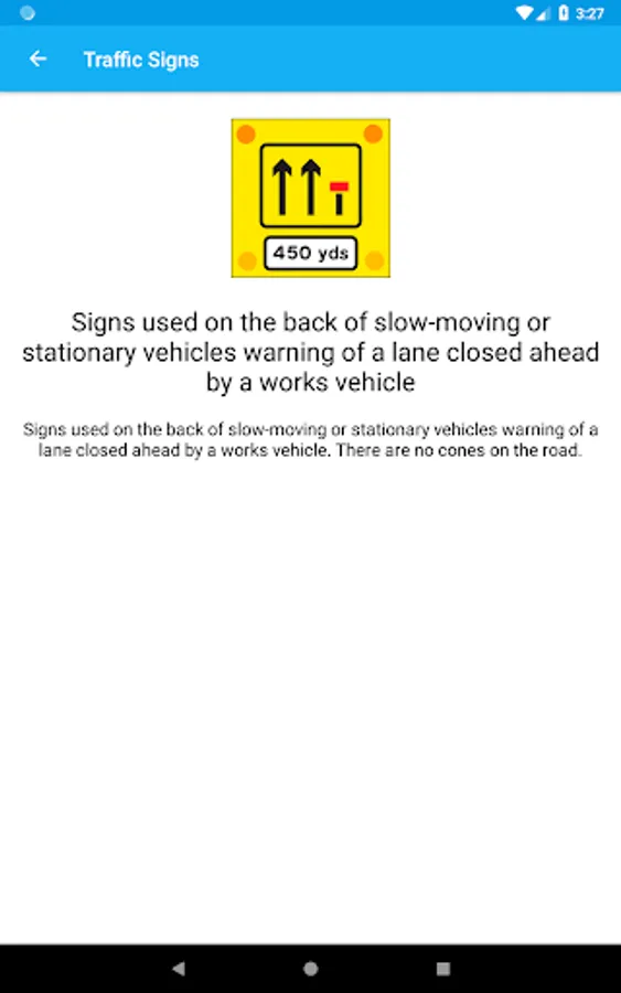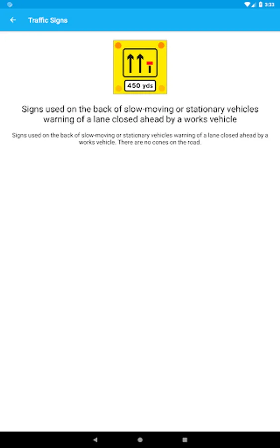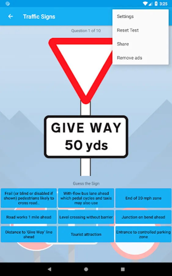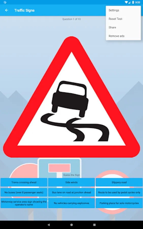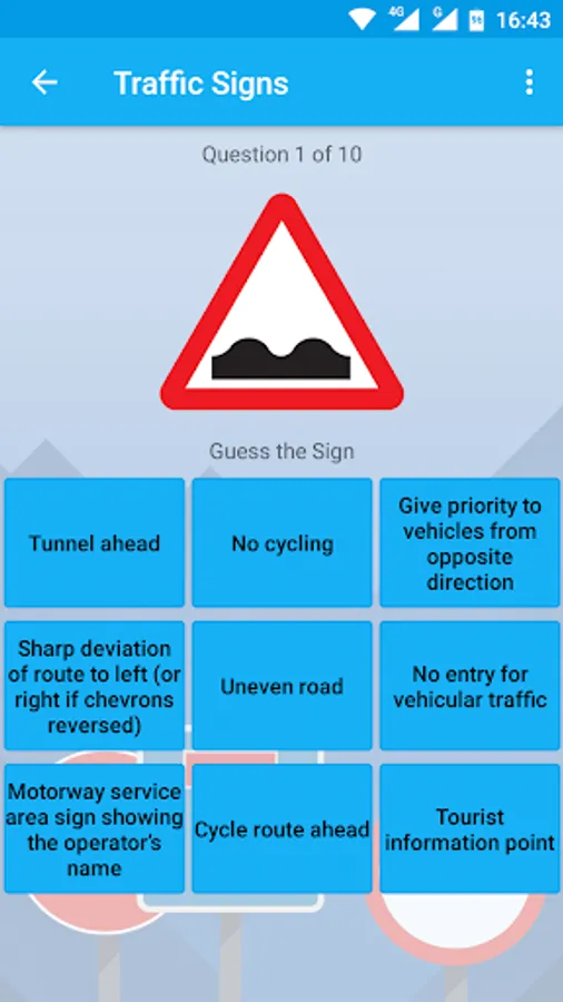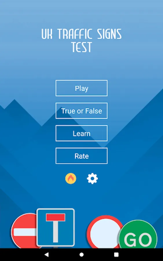 The United Kingdom's traffic signs test. In this application you can learn traffic signs in a game form. Our quiz is useful for students of driving schools who are going to take an exam for the license and for experienced drivers who wants to repeat the Highway Code.
