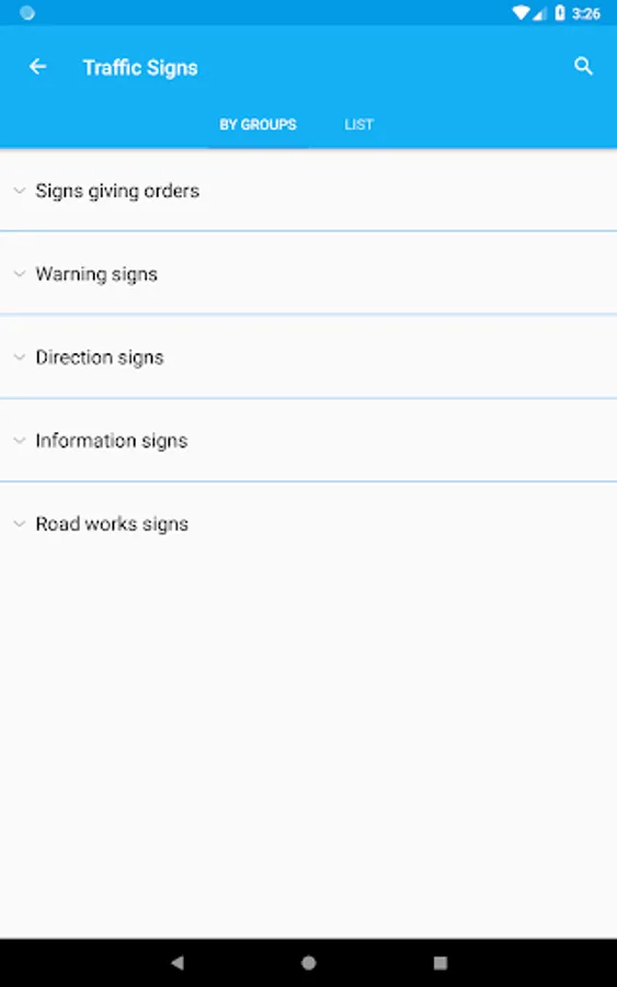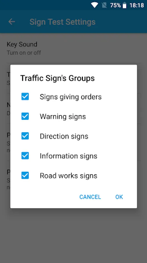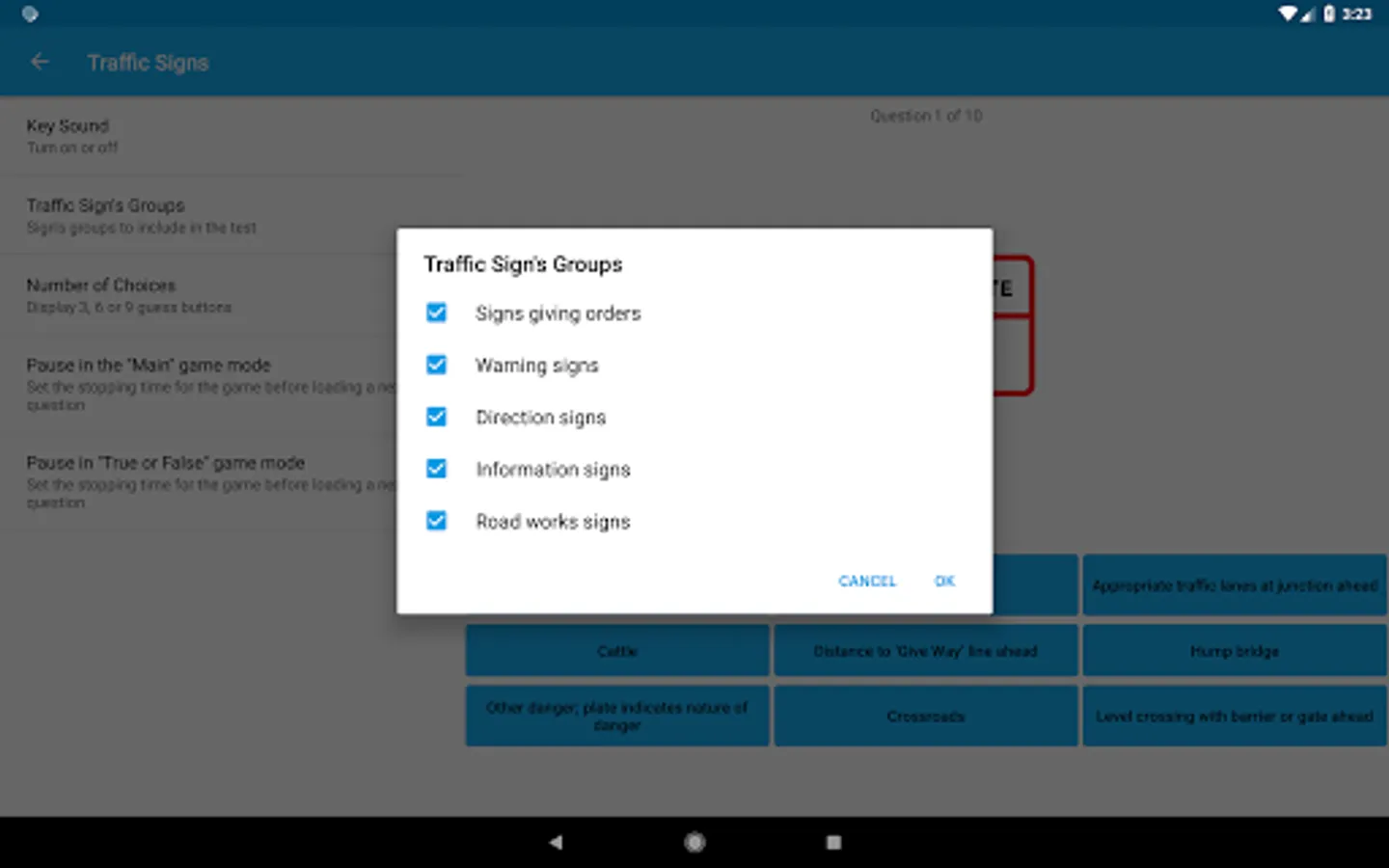 *Select the road sign's category. You can choose necessary groups of road signs to exercise and guess only their;