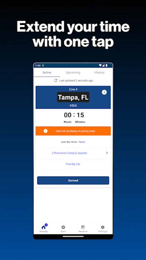 • Streets, Lots, and Garages: Enter the zone number on the posted signs in your area. Select the amount of time you want to park, and start your session. Extend time in the app if you are running late.