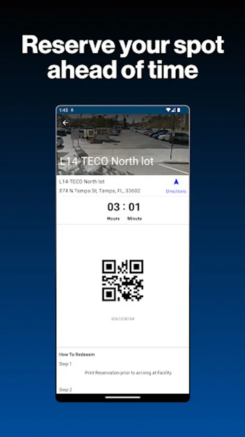 • Parking Reservations: Search for where you want to park and select the specific parking facility. Choose the date/time and complete your reservation. Follow the instructions in your confirmation to redeem at the parking facility.