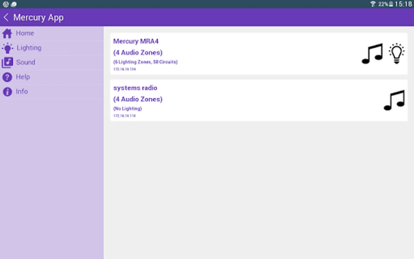 The App works in conjunction with all Ethernet enabled Mercury® lighting control and audio systems (MRA4D, MRA4, MRA2D, MDP4X600+3AR+E, MDP12X600+3X3AR+E, MDP16X600+4X3AR+E, MDP20X600+5X3AR+E, MDP24X600+6X3AR+E). Other custom built panels containing Ethernet capability are compatible - please refer to your instruction manual or contact our technical department if you are unsure.