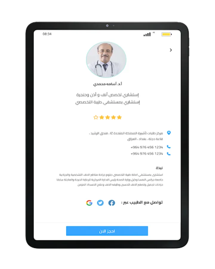 The application provides a platform to identify health service providers in a specific city in Iraq according to the required specialization and paves the way for telemedicine. Patients use it on the one hand to search for a doctor or health service provider suitable for their needs, with the possibility of making an appointment and sending their medical reports through the application. It is also used by health service providers on the other hand to register and provide data on their qualifications, specializations, achievements and services. The application provides the opportunity for each user to evaluate the services he receives from a doctor or another provider.