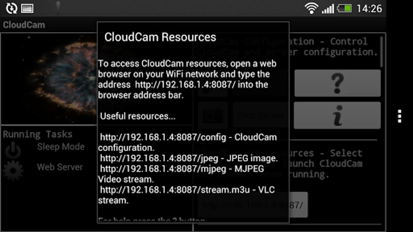 11. Free streaming server supports automatic presentation of real time streaming video content from the handset to waiting streaming players like VLC. Multiple streaming servers can run in parallel on a PC,Mac or Linux server servicing multiple CloudCam device allowing multiple CloudCam devices can be viewed from a single source.