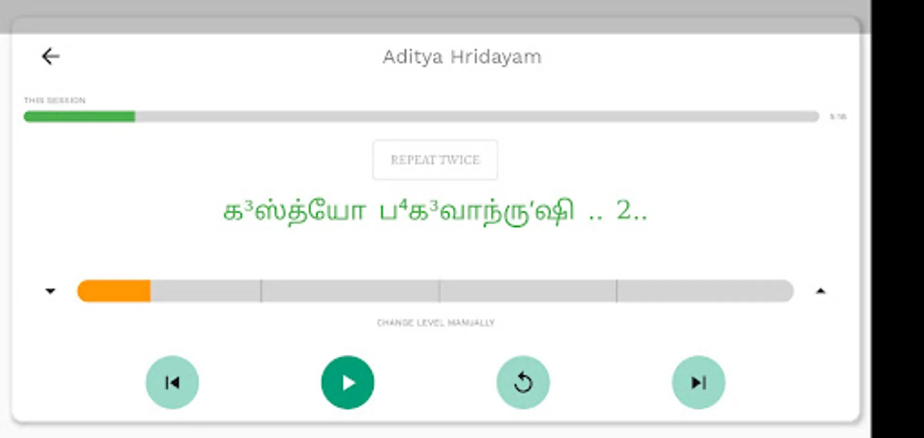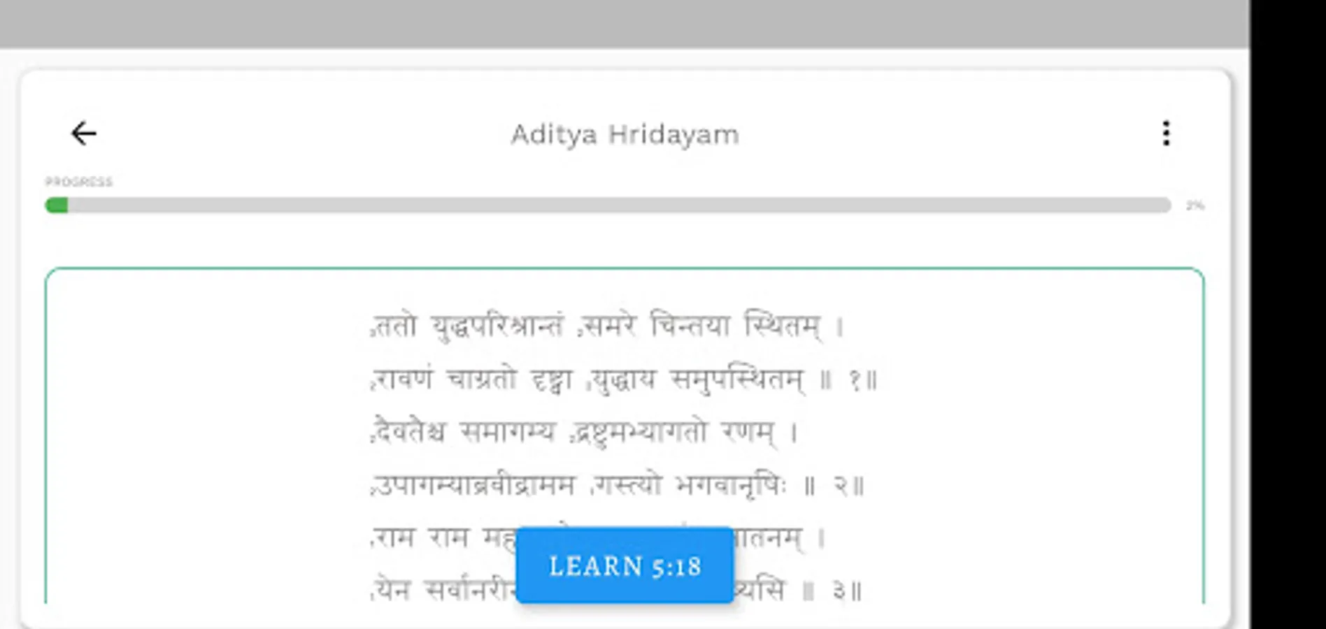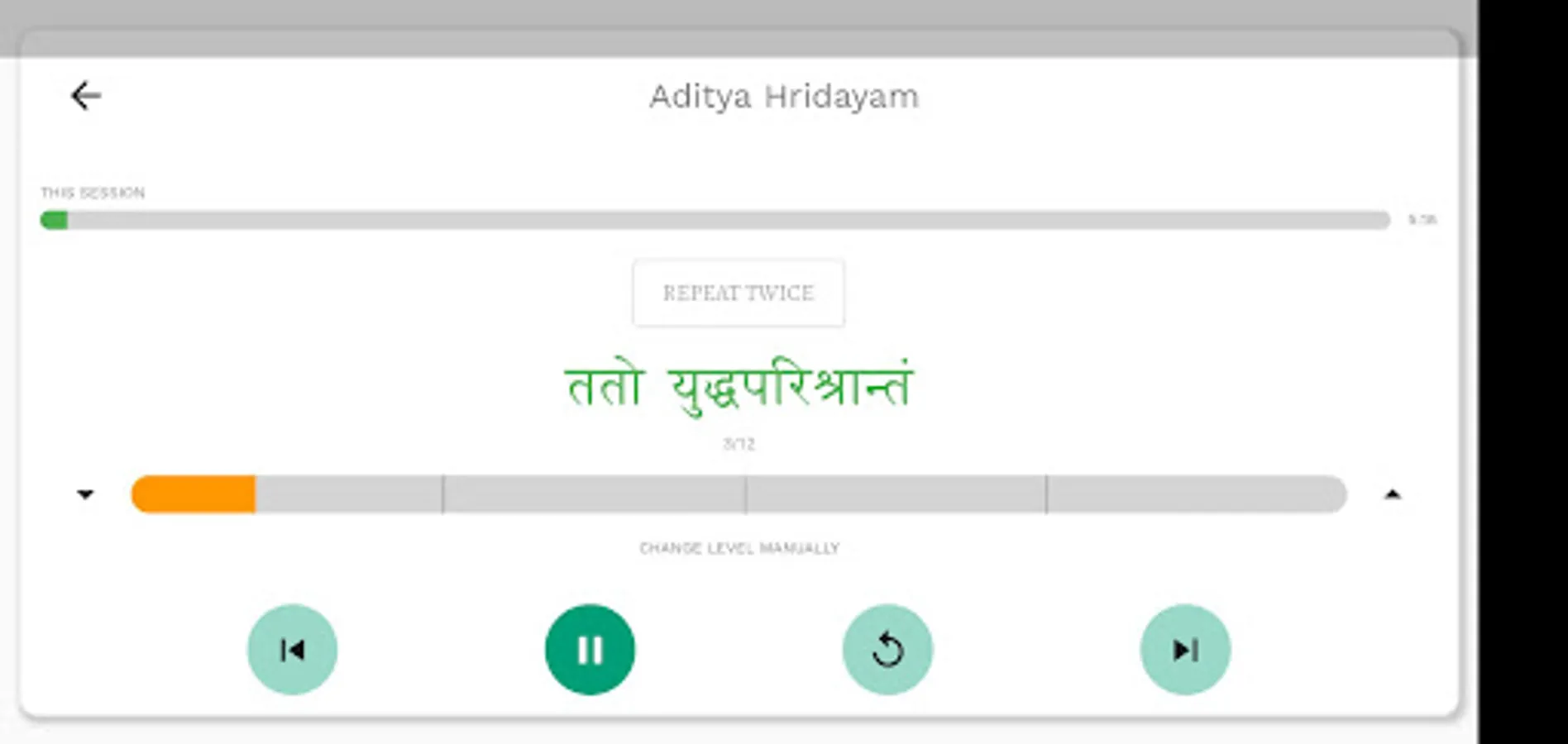 Practice daily in a scientific, systematic way to learn to chant the Aditya Hridayam by-heart. This app breaks up the entire scripture into small lessons. Learn each lesson by reciting phrases after an authentic recording with perfect pronunciation. As you practice more, the phrases get longer to keep you learning.