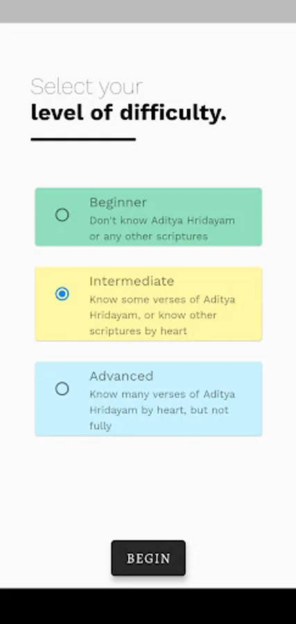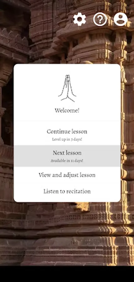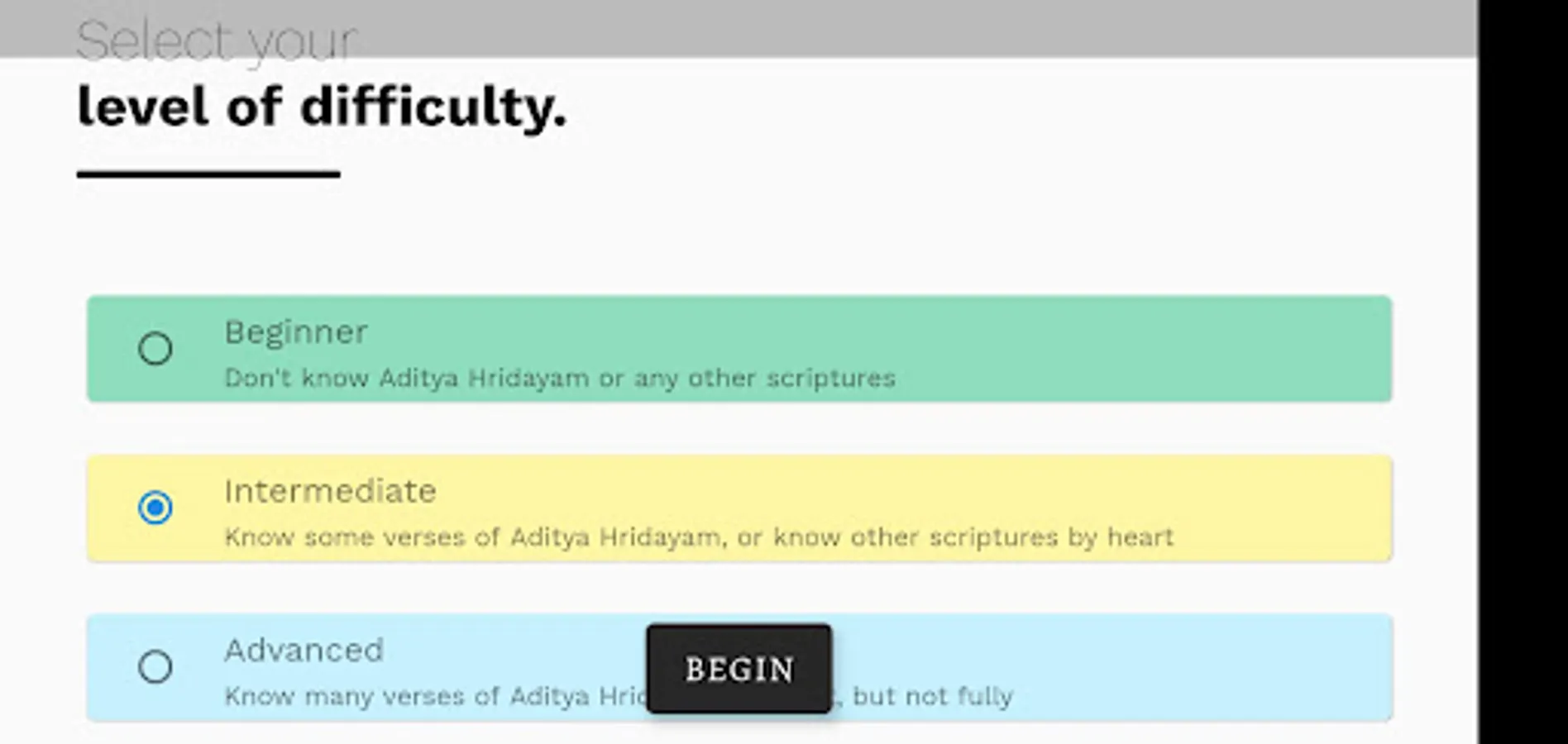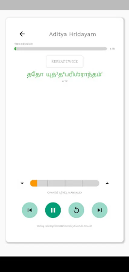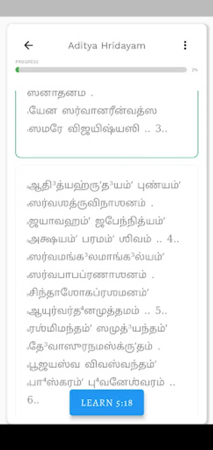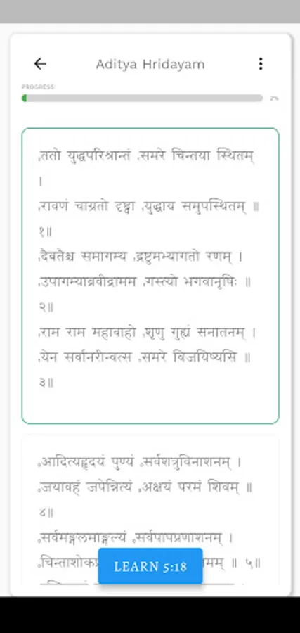 Practice daily in a scientific, systematic way to learn to chant the Aditya Hridayam by-heart. This app breaks up the entire scripture into small lessons. Learn each lesson by reciting phrases after an authentic recording with perfect pronunciation. As you practice more, the phrases get longer to keep you learning.