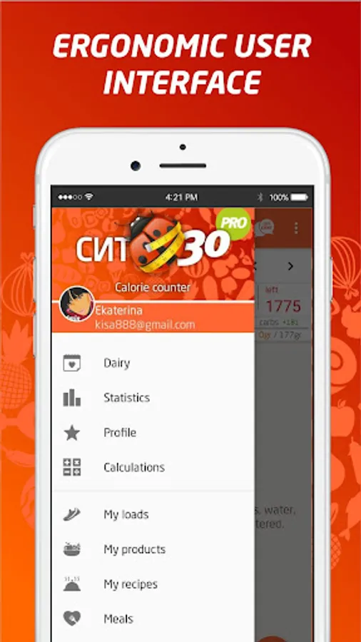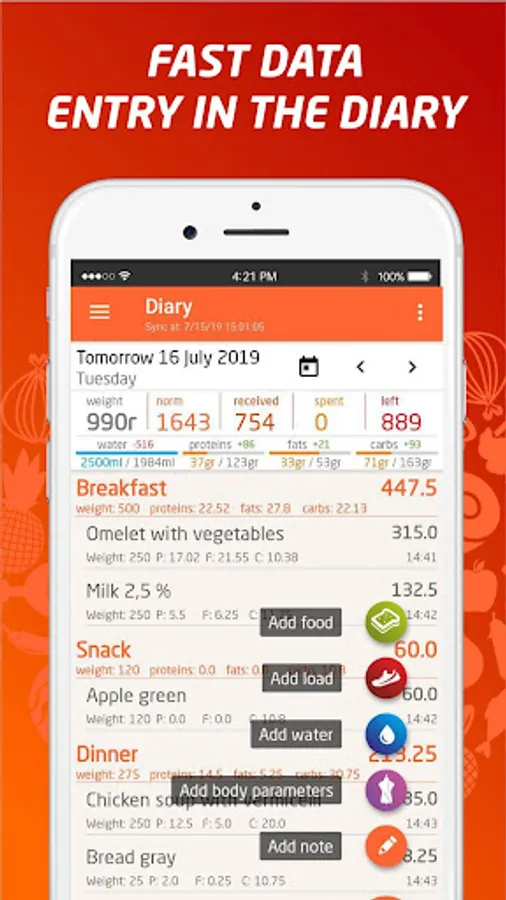 The largest base of food calories, a convenient ergonomic interface, fast data entry and a personalization option will help you control your weight, whether you choose to loose or gain it.