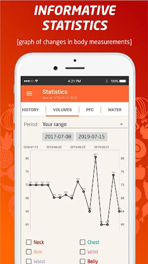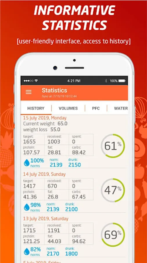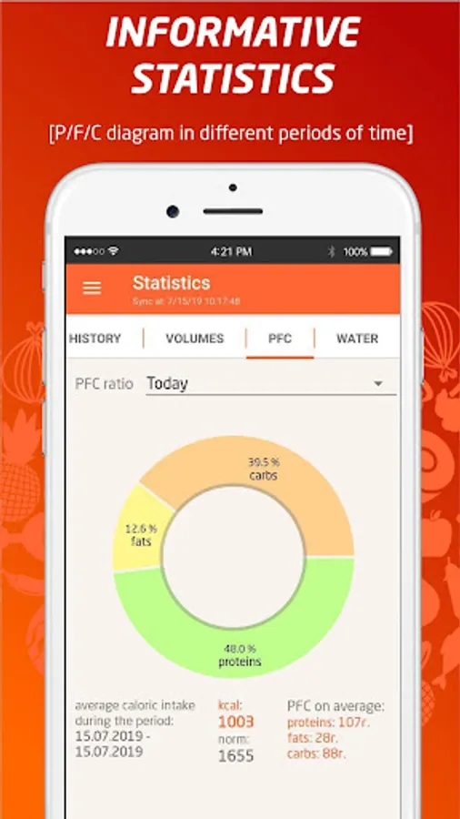 • Comprehensive statistics (control of proteins, fats, carbohydrates and calories, control of consumed water, weight and volume graphs, PFC ratio diagrams).