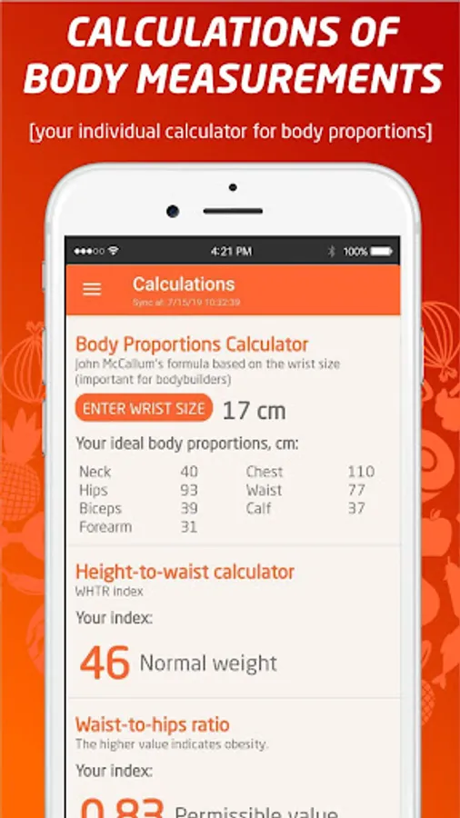 • A variety of calculations (Mifflin-St.Jeor formula, John McCallum's body proportions calculator, WHTR Waist/Growth Index calculator, water consumption norm calculation according to your parameters, body fat percentage calculation, etc.).