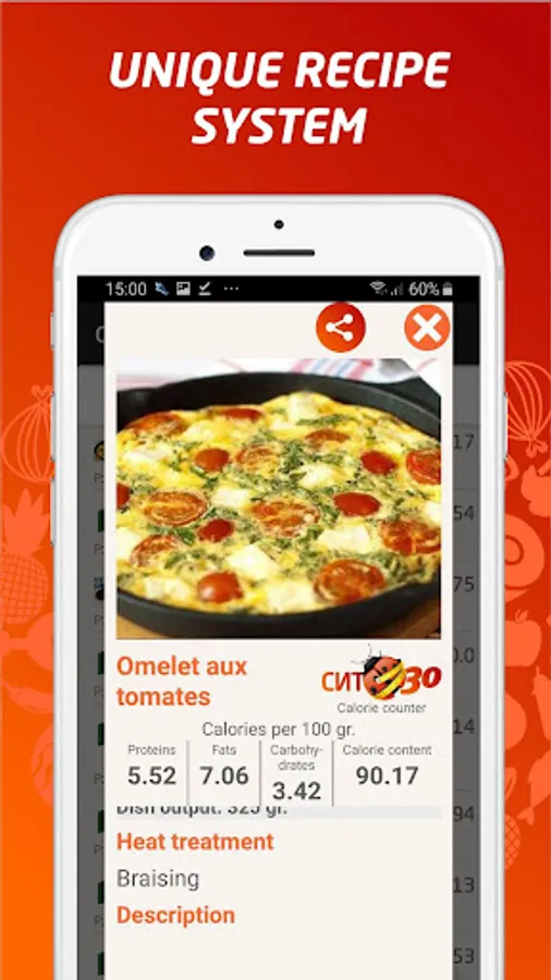 To make sure the caloric content of the dishes you prepare is calculated accurately, the counter includes a unique module, which helps you build the recipes taking into account the heat treatment of food (as it changes the calorie output), describe the cooking process, and share your recipe on social networks. You may expand your personal database with the dishes shared by other users, if you use the “add recipe by code” feature.