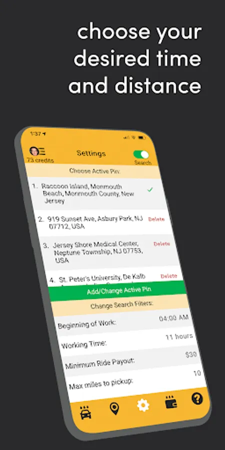 1. Skeddy stores the rides in a 10-mile zone from the arbitrary location (Search Pin) the driver defines. The driver can create and save search pins as favorites and reuse them for future ridesharing rides.