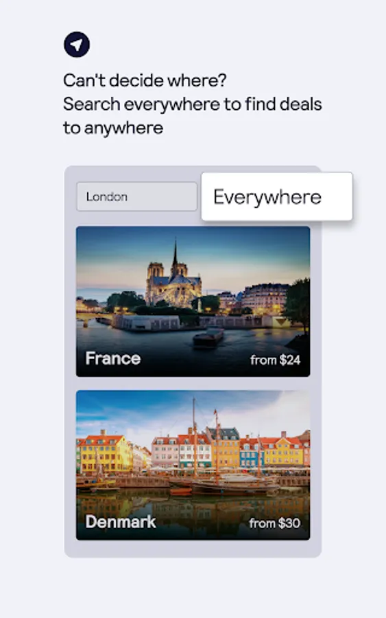 Can’t decide where? Perfect. Start by exploring everywhere first. Tap “Everywhere” in our search bar to find cheap flights literally anywhere around the world and get ideas for your next vacation.