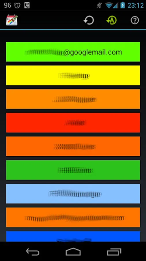 In order to let the app monitor the calendar colors and reapply your values automatically, touch the "Automatic Restore" button (the green/red arrow left with the "A" inside, green meens the automatic restore is active). This will start a background service, you might notice it by the little calendar icon in the notification area. This notification is needed, without it Android would kill the app after some time, because it is doing nothing most of the time. If you dislike this notification, you can disable it in the Android Settings: Apps -> Installed -> CalenderColors -> uncheck "Show Notifications".
