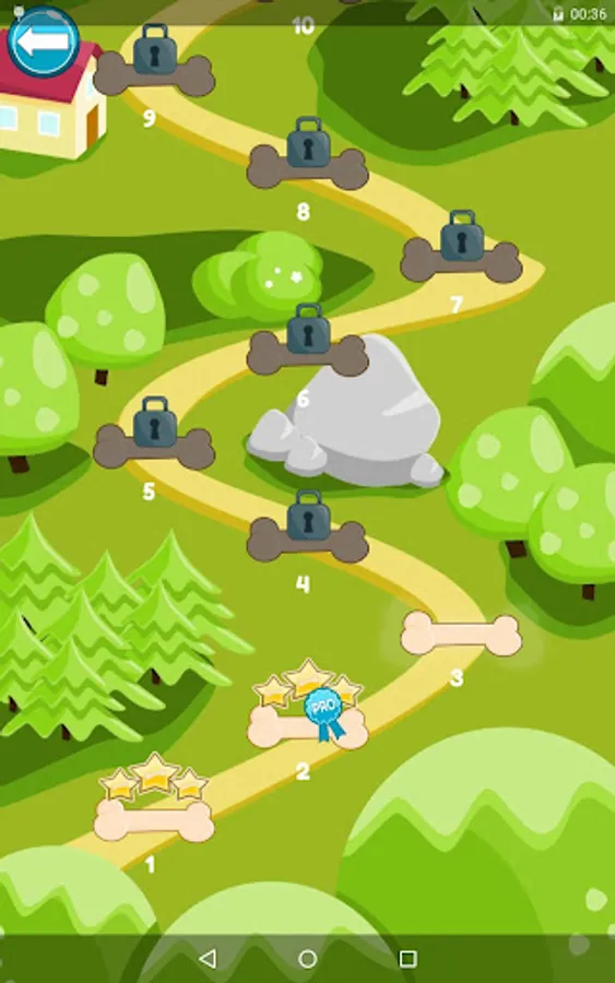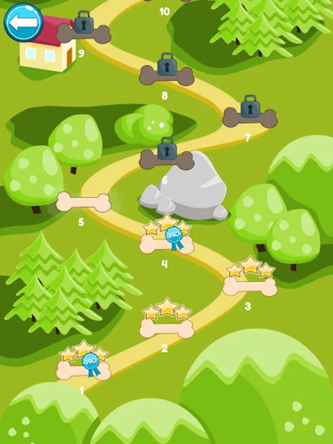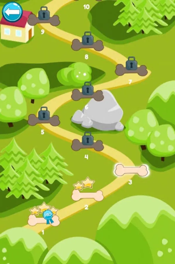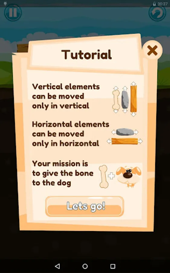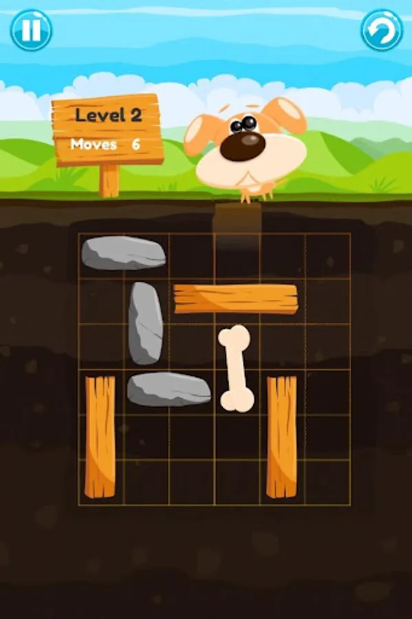Move the blocks – rocks and wood – with your finger to unblock the path for moving the bone right to the dog. Make him happy! Solve this puzzle for him! Exercise your brain! Everyone can enjoy it. But remember: vertical elements can be moved only in vertical, and horizontal elements can be moved only horizontal.