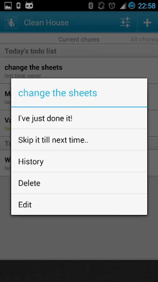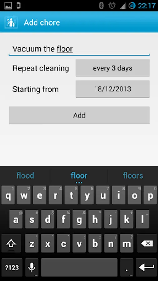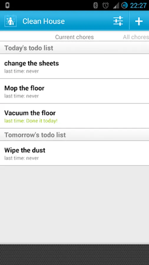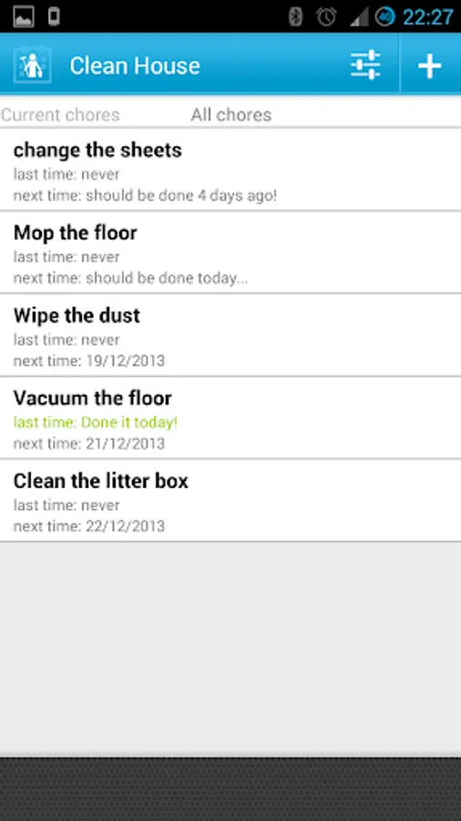 It's all to you - Set simple chores like "vacuum the floor", or "change the sheets", set your repeat interval, and the notifications will remind you, when to do your work! Simple as that!