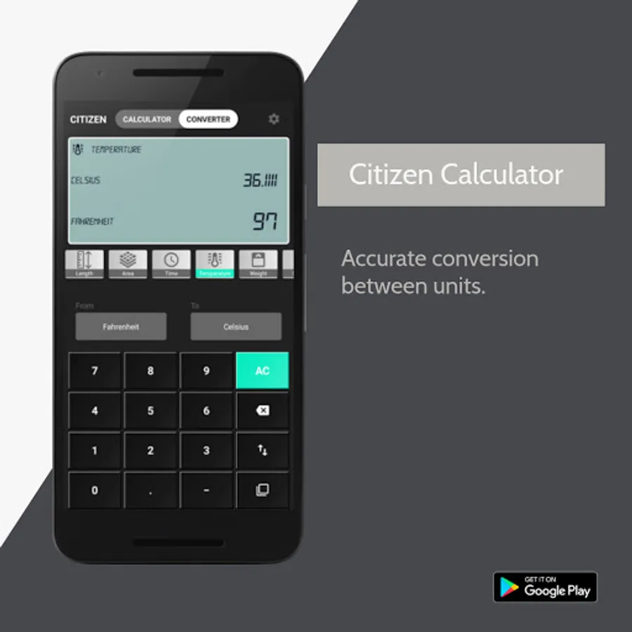 Citizen Calculator has all simple calculator features like (+) addition, (-) subtraction, (*) multiplication, (/) divide and (%) percentage.