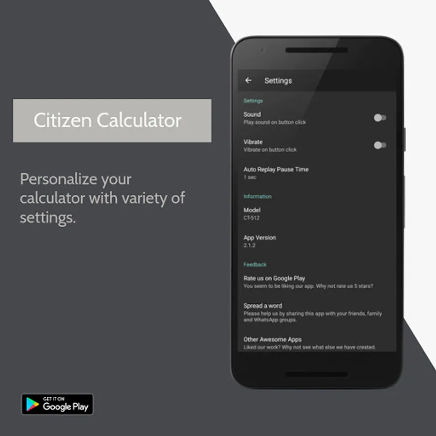 Citizen Calculator is given a touch of real calculator that includes vibrate on touch, click sound on touch, button pressed effects. However, you can always turn ON/OFF Vibration and or Sound of button press from settings.