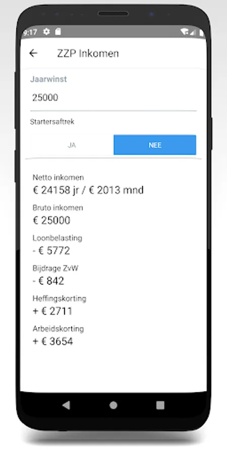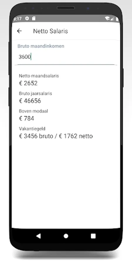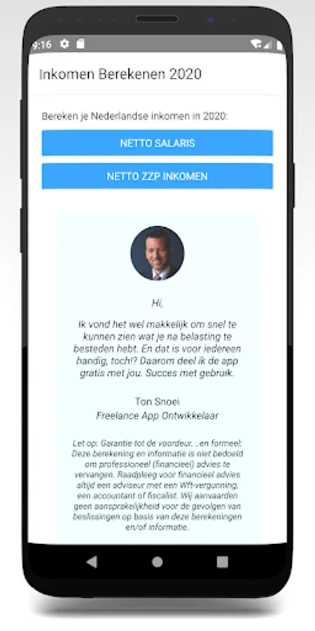 The app is mainly intended for employees or the self-employed who want to quickly see what is left over from the profit or the boss's salary. Suppose you want to start your own company, then you can quickly see what you have left after deducting your costs and taxes. Or suppose you start working for a new employer, then you can quickly calculate what you will have left with a new gross salary.