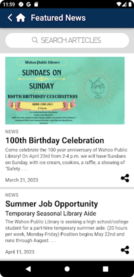 The Wahoo Public Library app is a great way to conveniently access the most recent news, announcements, and events.