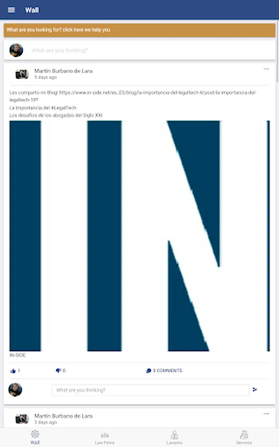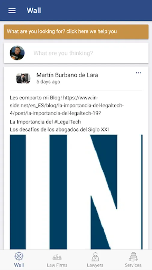 IN-SIDE is a digital platform designed to evolve the world of law. It is, mainly, a social network through which clients and lawyers can connect in a virtual way in which they interact, exchange information, negotiate and buy legal services that, being digitized, are transparent for the parties. We incorporate tools such as a CRM, a document manager, a process administrator, electronic invoicing and others that modernize, simplify and optimize the usual practices of lawyers, changing the way they work and in this way we change the image of the lawyer in society .