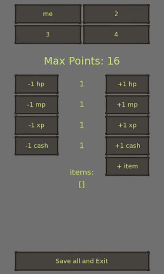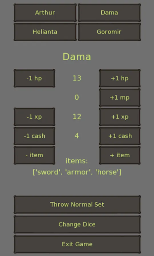With RenRPG you can create up 4 characters with health points (hp), magic points (mp), experience (xp), cash and items.