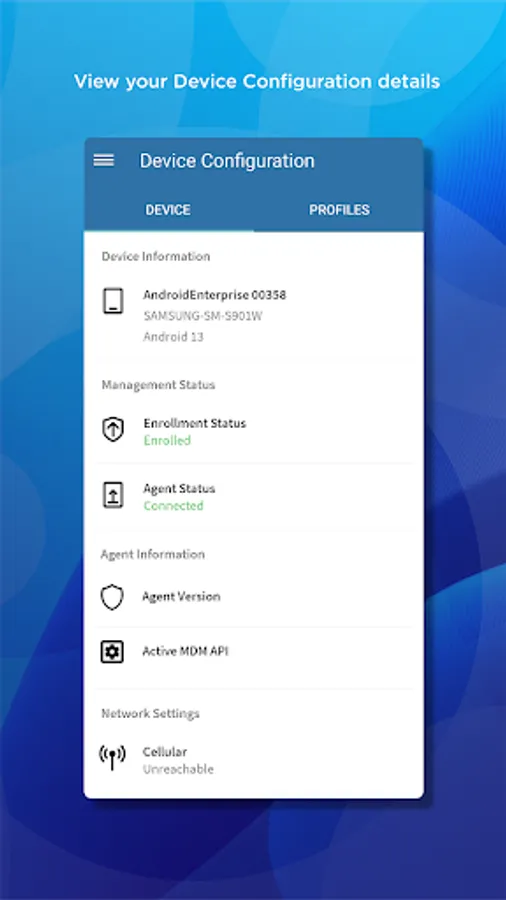 - Data Protection - A dedicated and managed Work Profile is isolated from Personal apps and data, and all business data and device hardware is encrypted and can be remotely managed.