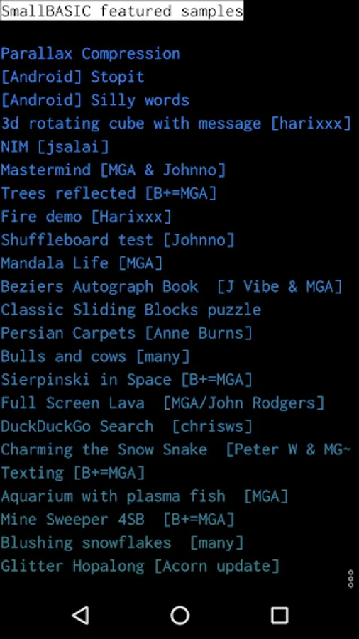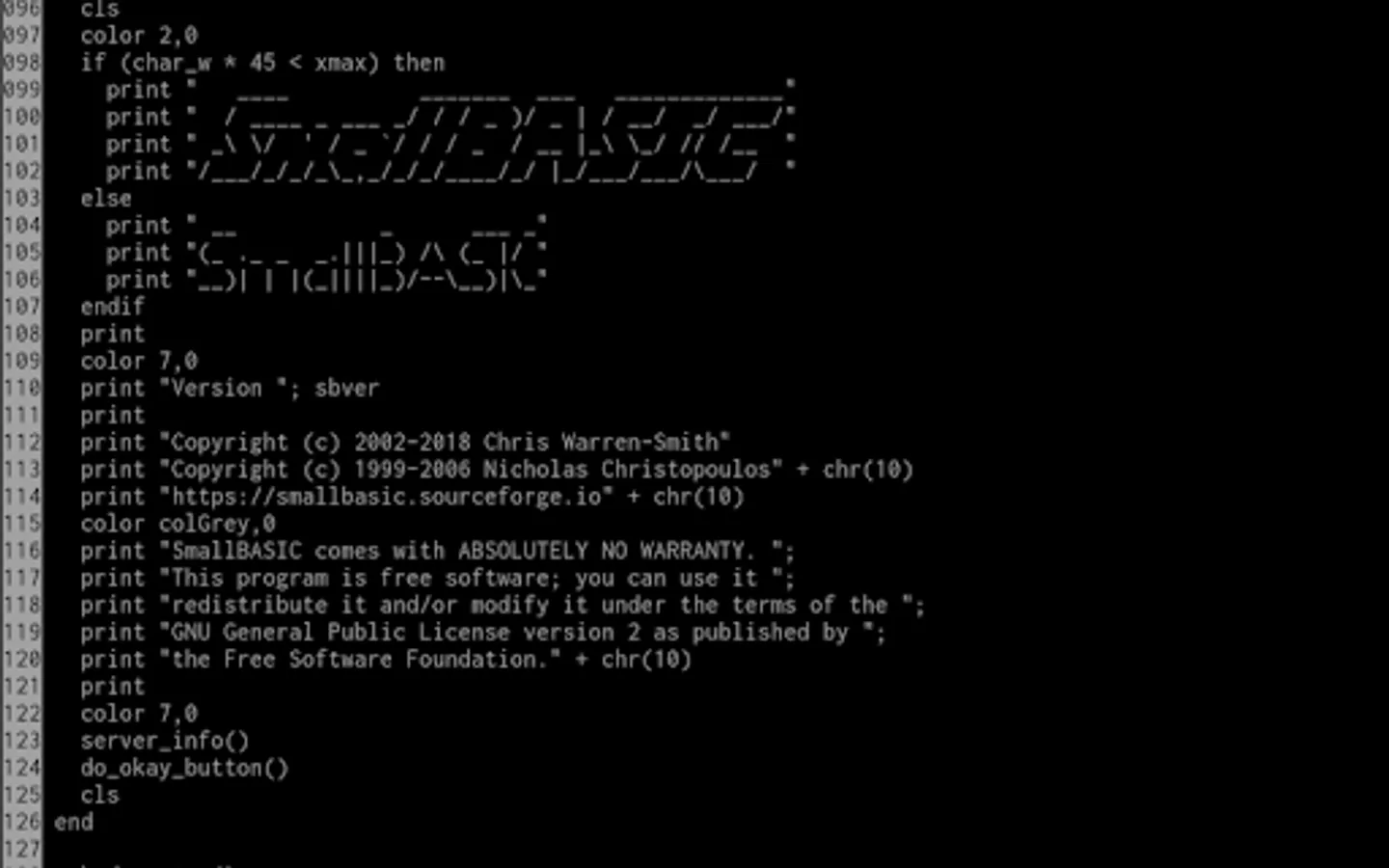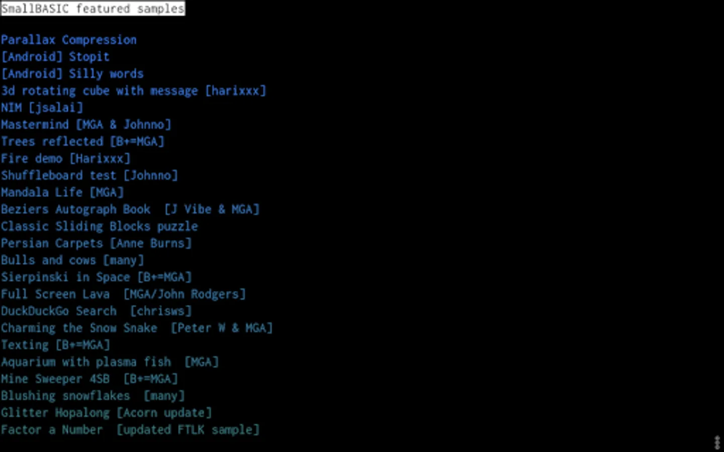 NOTE: This is *not* "Small Basic" from Microsoft. This is the open source GPL version 3 licensed SmallBASIC originally made for the Palm Pilot and later ported to the Franklin eBookman and Nokia 770 devices.