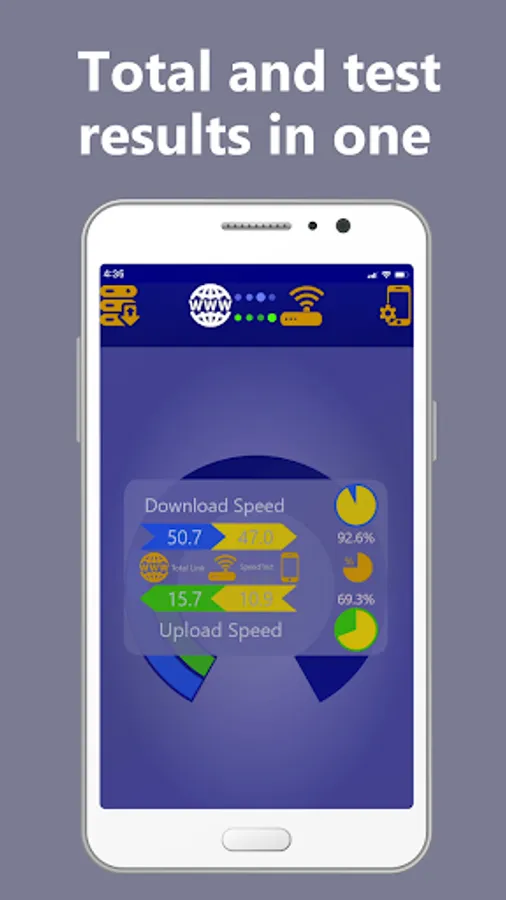 Go beyond the speed monitor by pressing the button to initiate a speed test, generating the extra www traffic (yellow) needed to push your ISP connection to its maximum speed. The bandwidth monitor confirms the bandwidth you are buying from your ISP, showing how much internet speed is currently available. The yellow arc shows the speed of the test, presenting how much bandwidth is available, followed by results giving your utilization as a percentage of the average total connection speed. Make sure you are getting the best Internet you can from your ISP with accurate bandwidth testing.