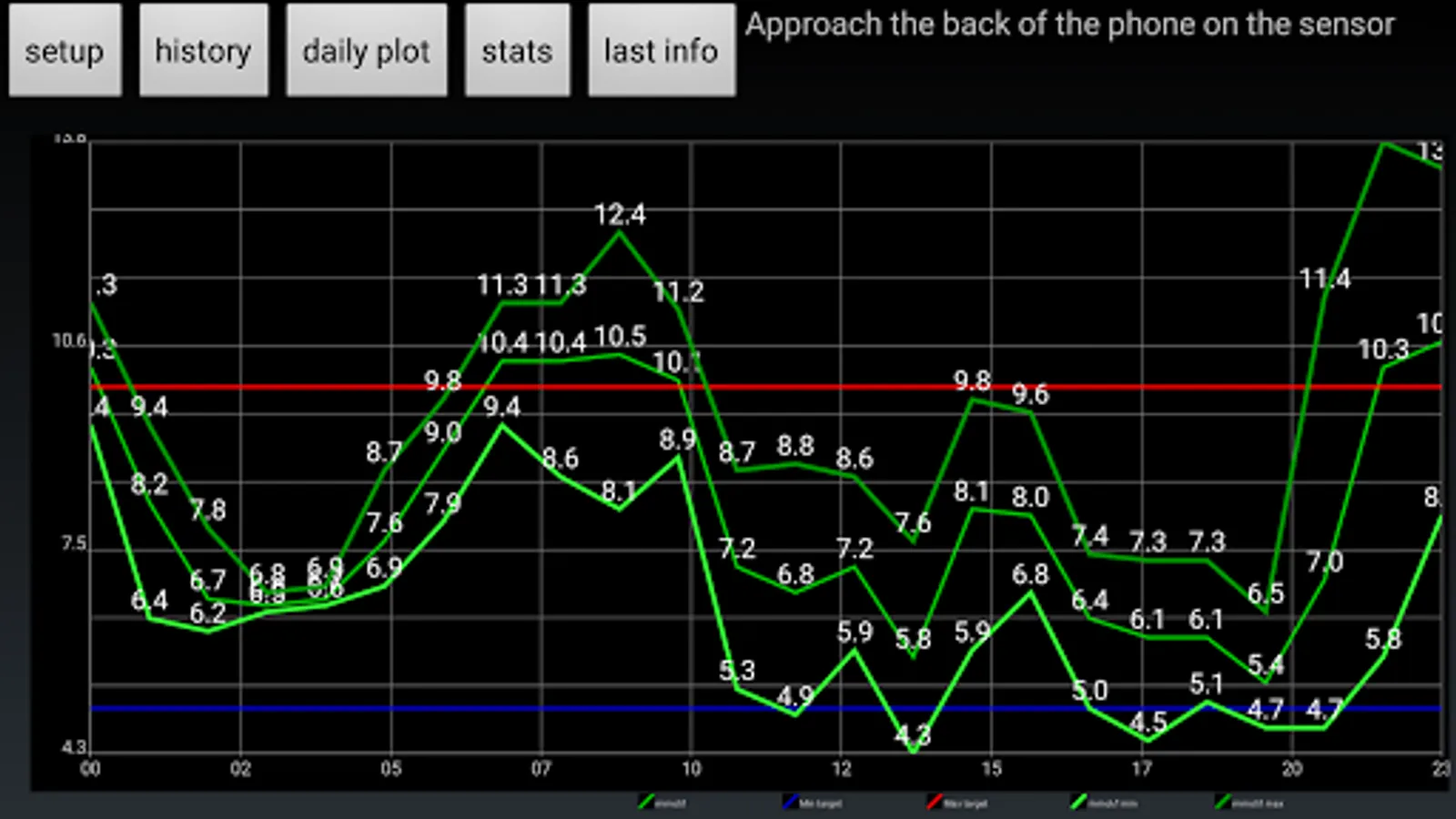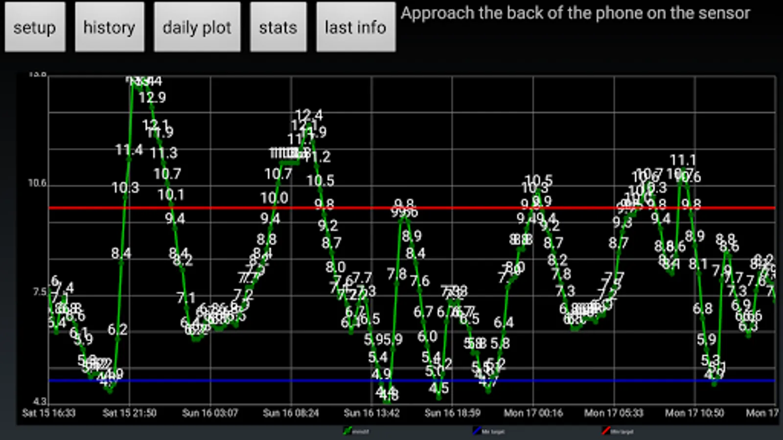 - read the last 8 hours of data from the sensor and display a graphic time vs blood sugar level.