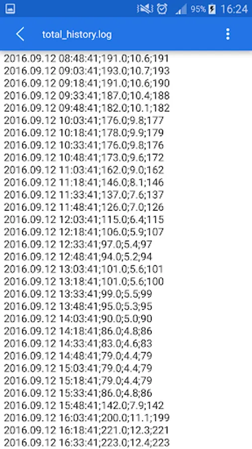 - store the data in a csv historical file, semi-colon separated, under sdcard/glycemia/total_history.log (format : timestamp yyyymmdd hh:mm:ss ; mmol/l corrected; mg/dl corrected; mg/dl raw value from sensor).