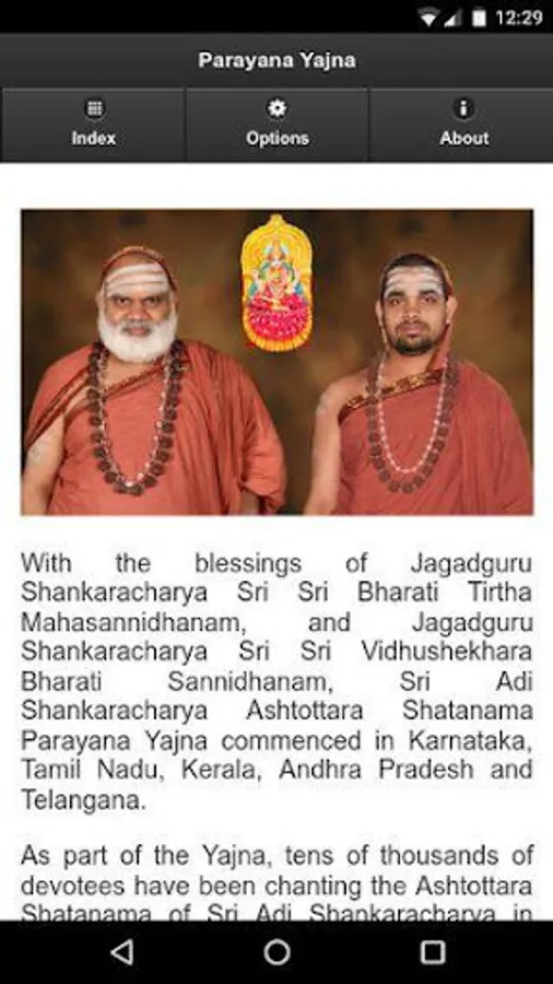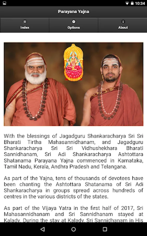 While the Ashtottara Shatanama Parayana Yajna is conducted in an organized way in the five South Indian states of Karnataka, Tamil Nadu, Andhra Pradesh, Telengana and Kerala, devotees outside these states can download this application and perform recitation of the stotras and be recipient of the grace of Jagadguru Sri Adi Shankaracharya and Goddess Sri Sharadamba.