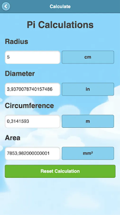 In addition to the various calculations (radius, diameter, circumference and area) an integrated unit converter was added to all calculations.