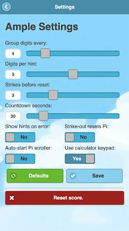 Ample settings compliment your learning experience. Choose to use the calculator keypad layout or change Pi digit grouping values according to your preference.