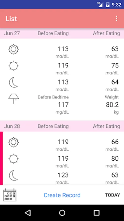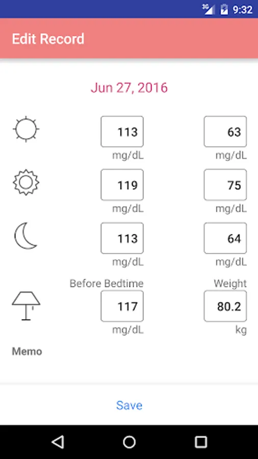 • Can record your blood glucose in the morning, noon and evening, as well as your weight on that day