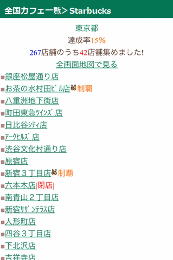 *都道府県ごとに、自分がチェックインしたカフェのコレクション達成率が表示されます。
