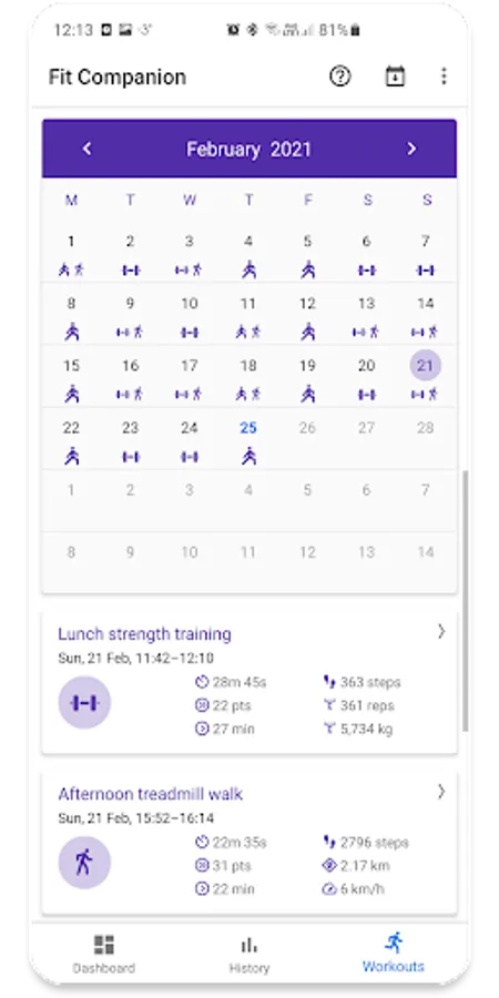 ߦ A monthly workout calendar showing a monthly overview of all your logged workout sessions.