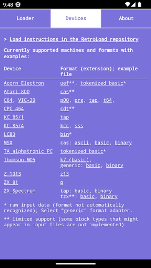 Supported devices currently include: Atari 800, C64/VC-20, Amstrad CPC 464, KC 85/1, KC 85/2-4, LC80, MSX, TA alphatronic PC, Z1013, ZX 81, ZX Spectrum