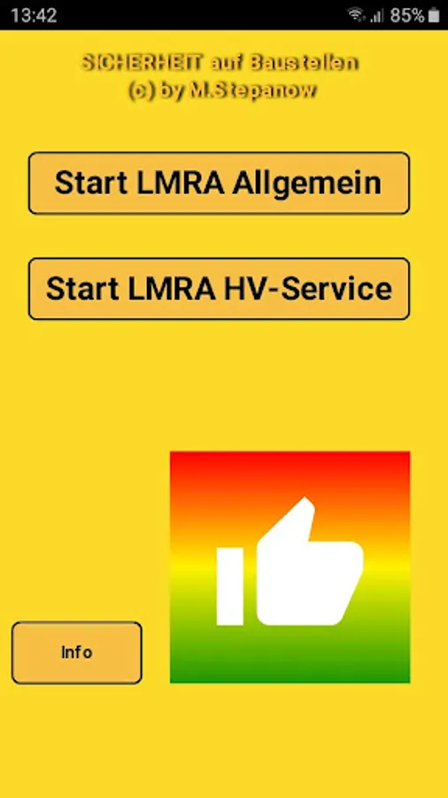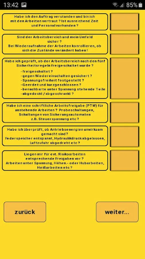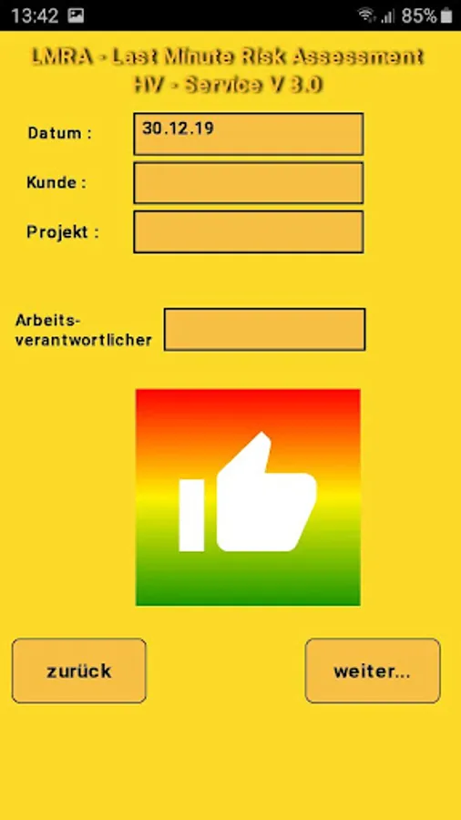 The app can be used to create two different last-minute risk assessments. The app guides you through the selected questionnaire (general or high-voltage service) and at the end creates a form that is sent to the employer for documentation by email. It is possible to attach a photo (e.g. certificate of approval).