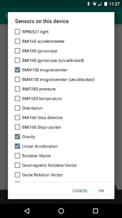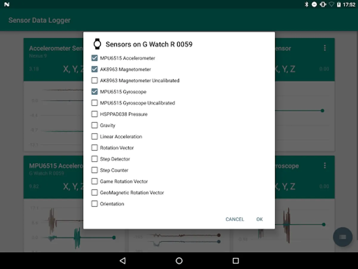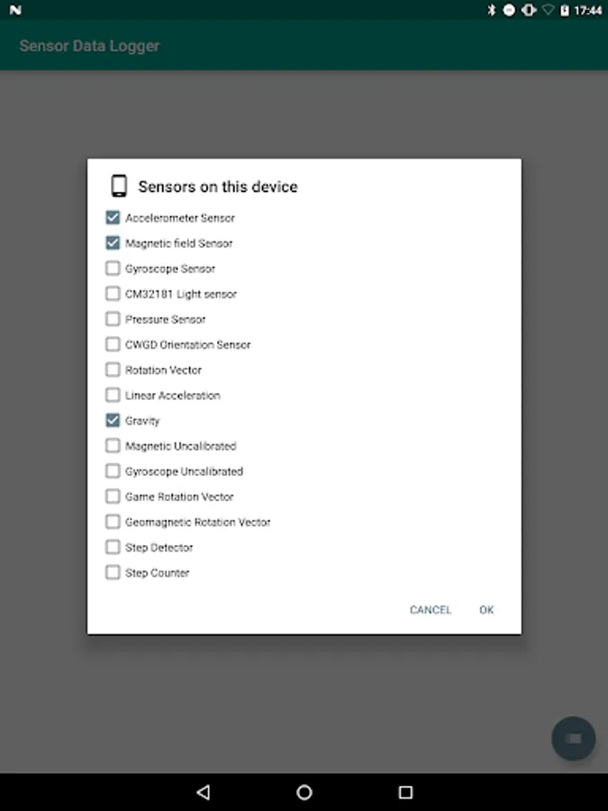 The sensor data logger can display data from all generic sensor types, such as acceleration, force of gravity or magnetic field. In addition, it can visualize all device specific sensors that you might have, such as double tap, step detection or temperature.