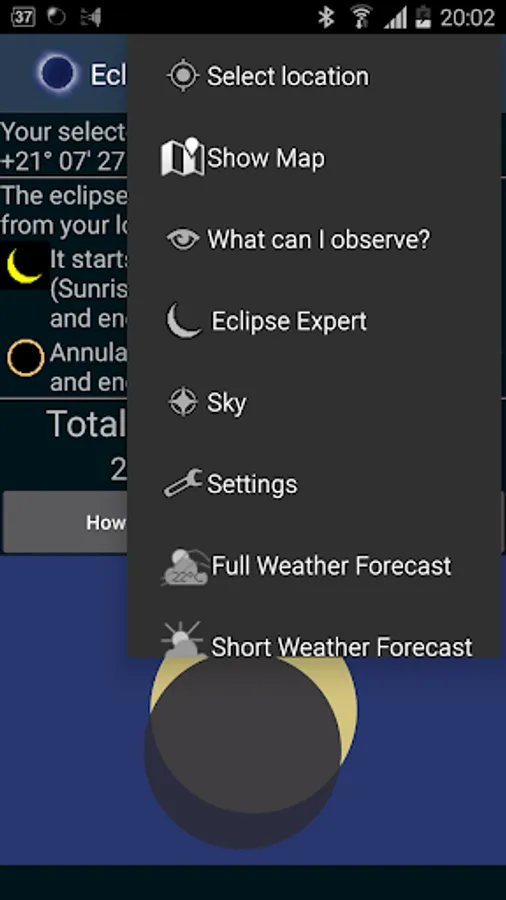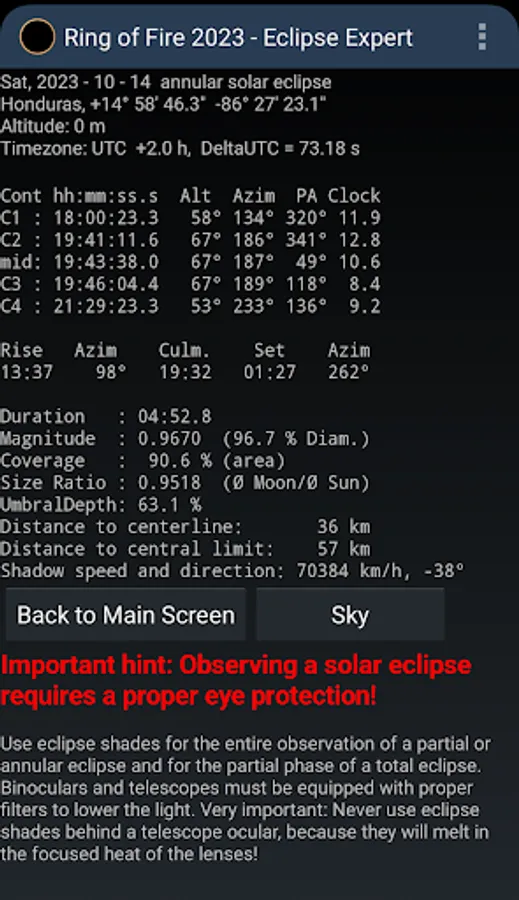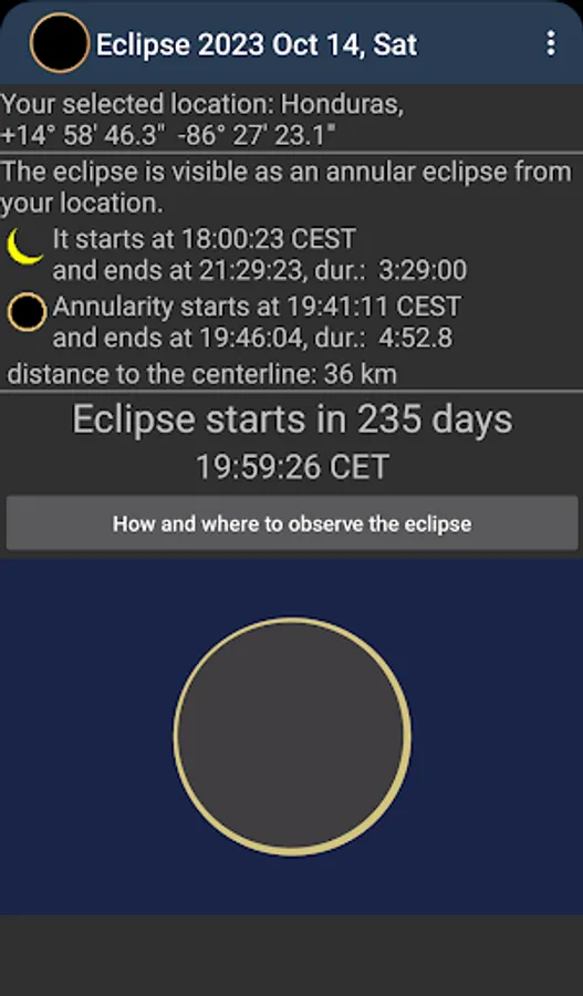 Engaged amateur astronomers will find a screen with detailed information and the local circumstances of the eclipse.