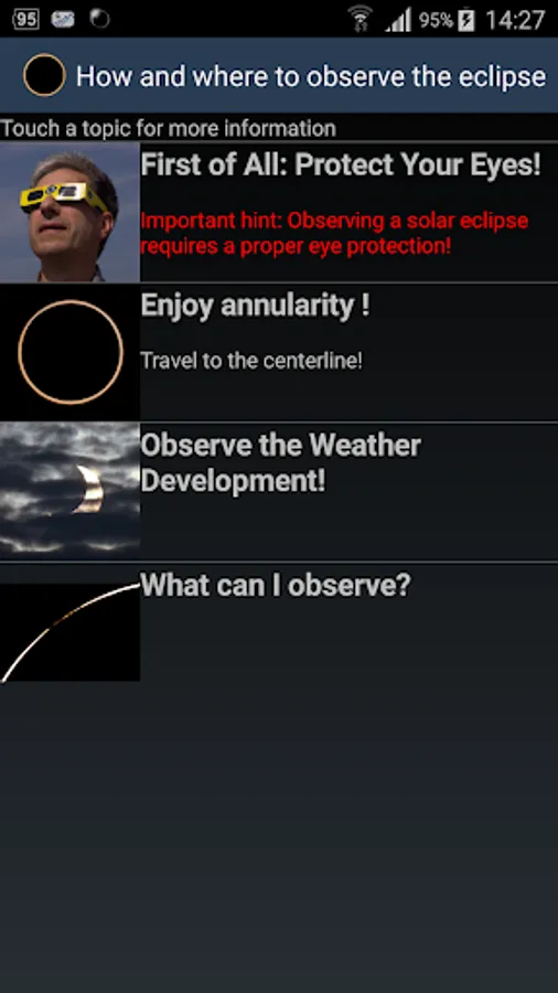 The app informs you about the exact timings of the eclipse based on your individual GPS or network position. It will show you a map with the entire eclipse path, giving you details on times and local circumstances. Even before the eclipse you will see an animation of the event as it will be seen from your location. When the eclipse is in progress, it will show a realtime animation of the celestial event. You will hear acoustic announcements of important stages of the eclipse and see a countdown on your display. Search your favorite location from a huge database or from the map or simply use your actual device position.