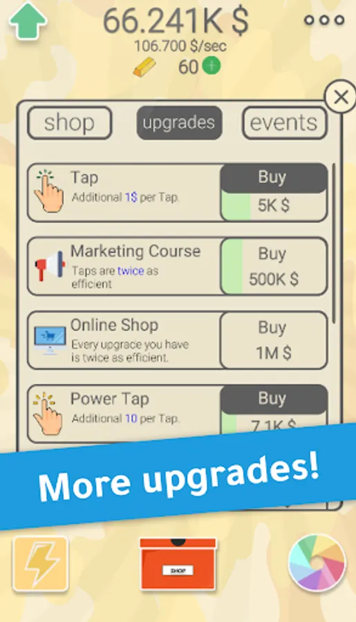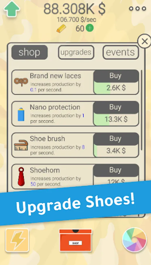 There are two categories of upgrades – Addons and Upgrades. Addons section includes various different items that automatically generate money such as New Laces or Shoe Brush. Cost of these buildings increases incrementally. The upgrades section contains upgrades to improve your clicking rate and the amount of money you generate per click. This game is progressive and in no time at all you will be earning enough money to finally afford all JS23 or Lebrons you've dreamed of and your popularity will grow. Sneakers Clicker is a must have if you are a hypebeast.