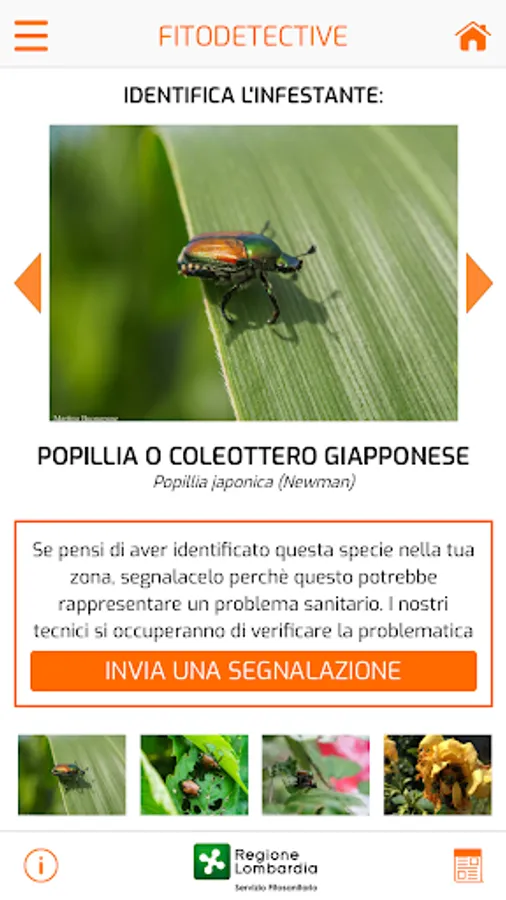 - send a report of the suspected presence of the main alien harmful organisms for which the phytosanitary service is active. The system allows to geo-refer the user who is invited to participate in the surveillance of the territory by sending a simple text card and one or more photographs. The application allows the signals only from the Lombard areas where the harmful organisms are not yet known. The reports received will be verified by the Phytosanitary Service. The application does not collect reports for harmful organisms now widespread throughout Lombardy as the Asian bug or for organisms such as Xylella fastidiosa whose presence has never been established in the territory of Lombardy and whose symptoms can be confused with those due to multiple other biotic and abiotic problems.