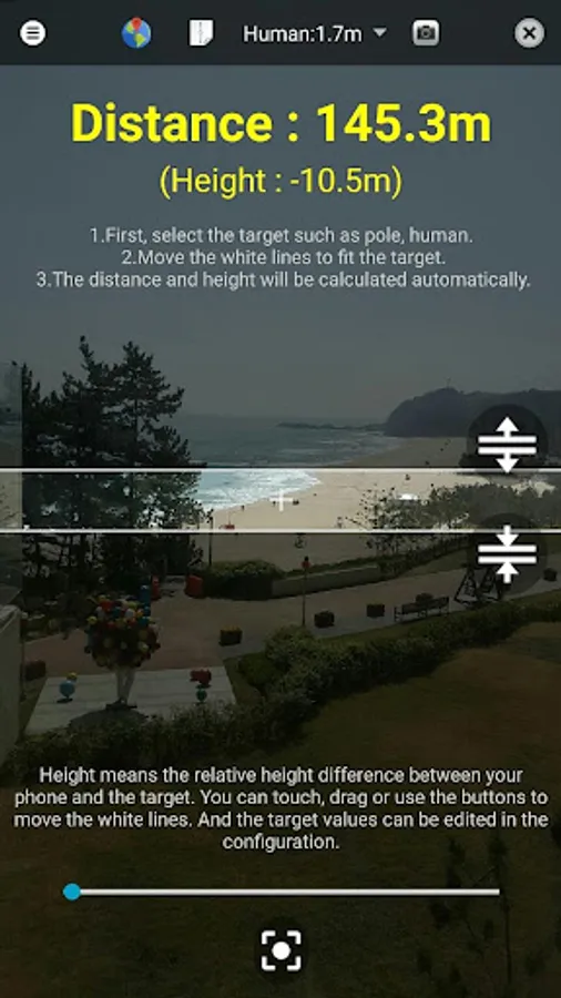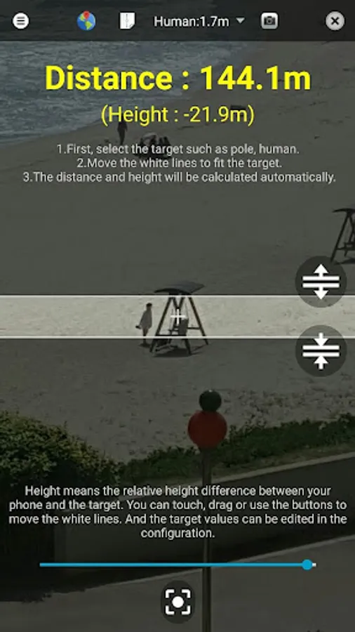 2. If the object has been designated by screen touch, drag or button, the distance and height are calculated immediately.