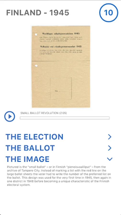 ”The Ballot” is an exhibition to learn about the development of democracy seen through the ballot - this small but highly significant artefact. Why do the ballot papers look the way they do? How come the ballots are so different between similar countries? Can the ballot affect the preference of the voter? How the ballots represent political trends and events over time? This app provides audio commentary on the ca. 75 ballots that are shown in the exhibition.