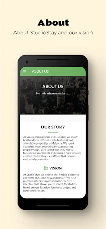 Our mission is to provide young couples, professionals, and students with a reliable and affordable solution to their housing needs. Join us on our journey to make renting studios in Malaysia easier than ever before.