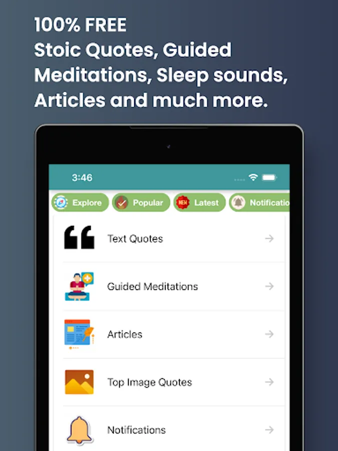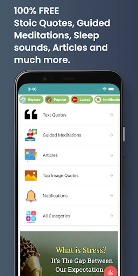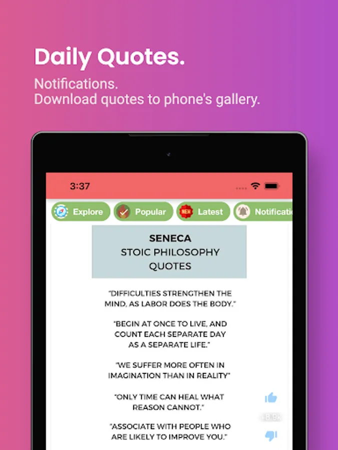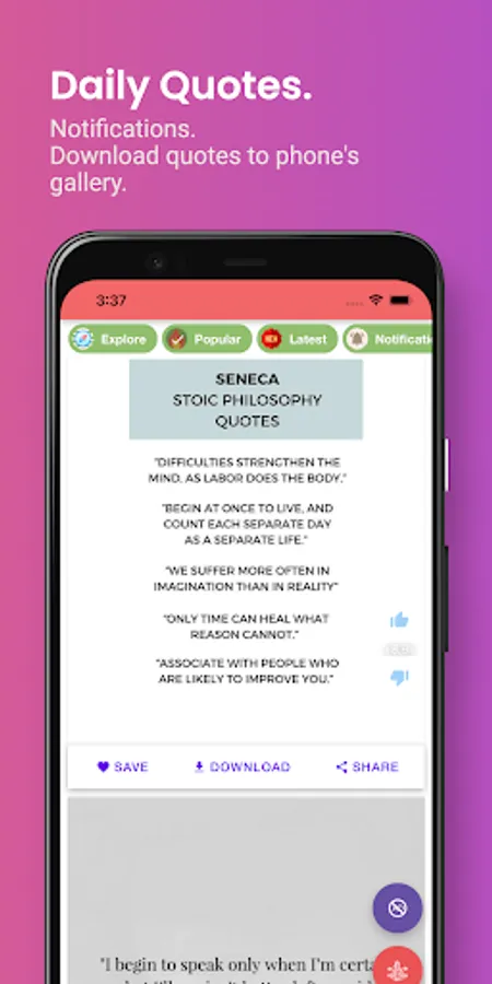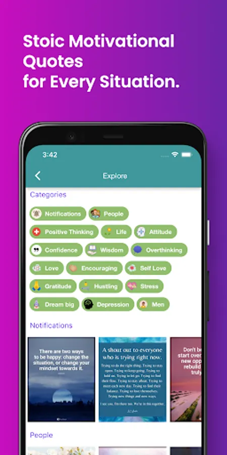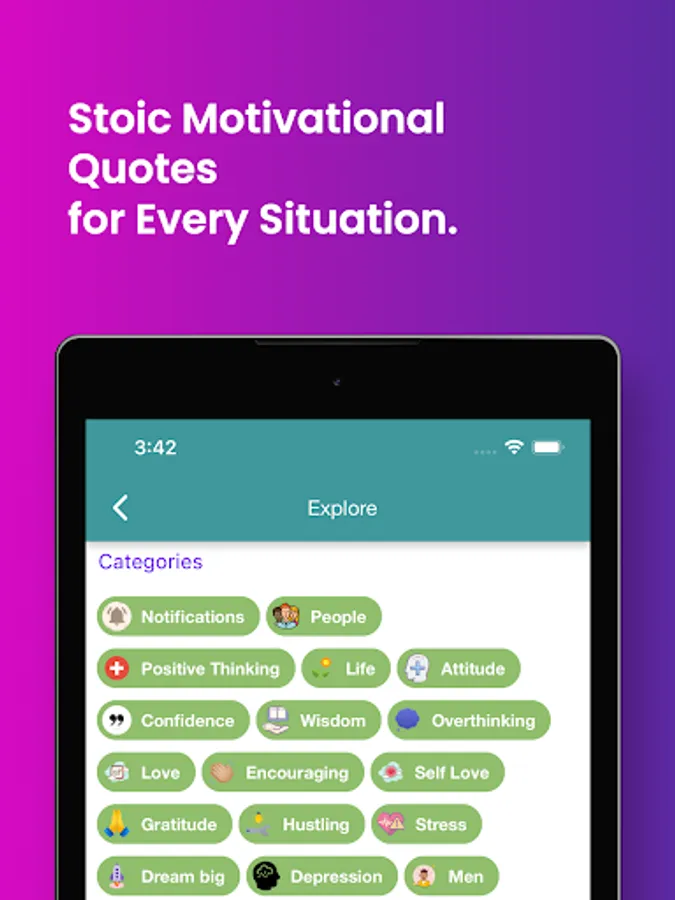 Stoic Motivational Quotes & Greek Philosophy with daily quote notifications. 1M+ Quote pictures and texts. You can favourite quotes, copy and share with your friends. Breathing exercises to improve your focus and mood. This app lets you browse famous stoic quotation, mark them as favourite, and share with your friends or near and dear ones. All the wisdom gathered in one place. We wish to give all the people in the world the most inspiring and motivating quotes to help them the throughout all their challenges! We have gathered some of the most amazing motivational quotes and wisdom from Greek Stoic Philosophy in this one App. You can access these quotes anytime, anywhere. Save your favourites, share them with your friends, or use them as your own personal motivation! These words of wisdom will help you through every challenge you face, so that you can achieve anything you set your mind to! So download now and get inspired!