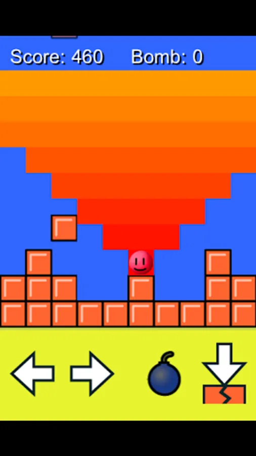 - Press BOMB button to use a bomb and clear all the blocks above him. You get a new bomb every 500 points of scores.