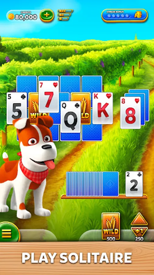 The tripeaks solitaire fun goes on: grow new crops as you work your way through each field. Upgrade the crates that await at the end of each field for an even bigger harvest, with credits, boosters and more. And now the farming fun is even better with the new MyFarm feature: collect gems at each solitaire level and use the gems to build your very own customizable farm, including a special corner for Sam the Solitaire Grand Harvest dog!