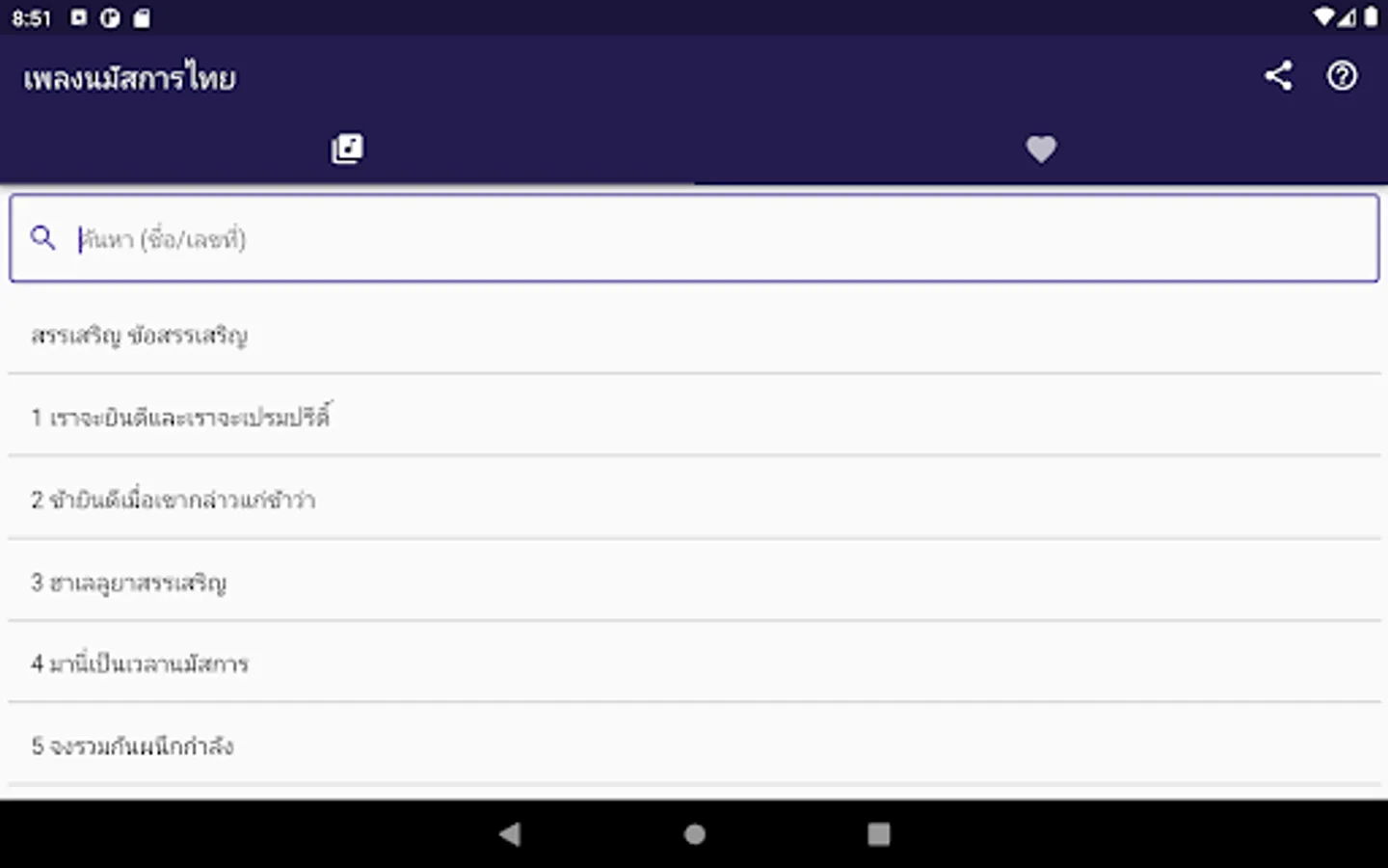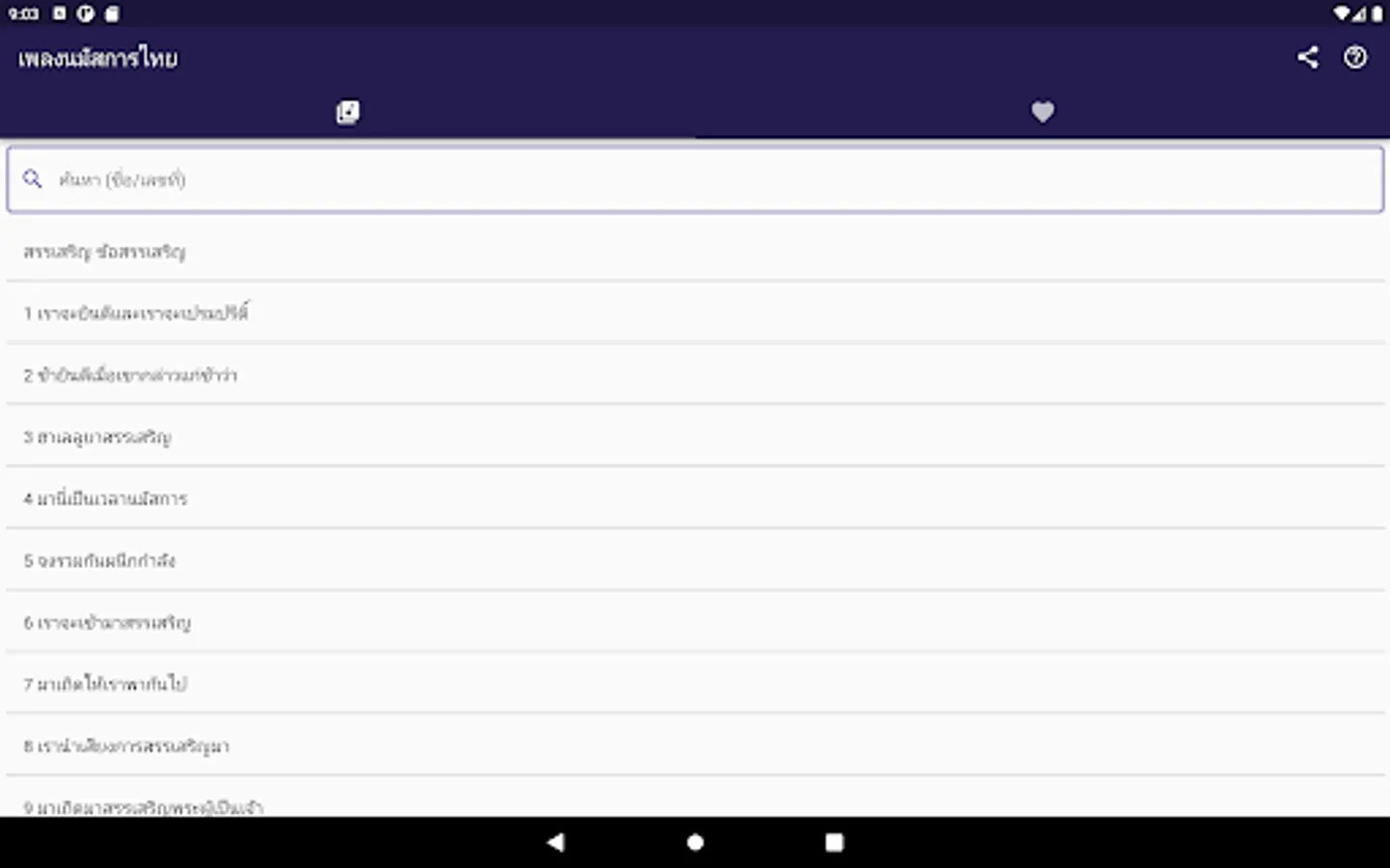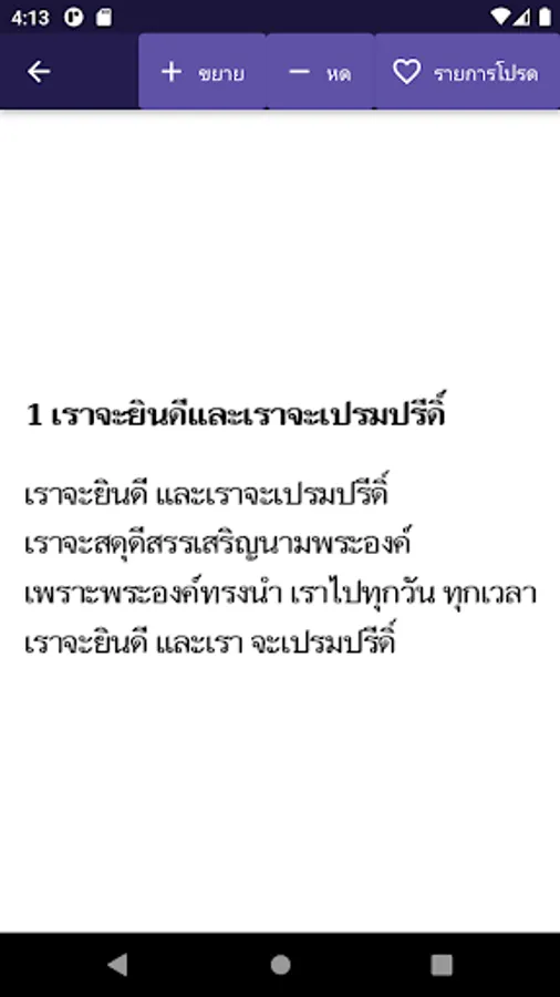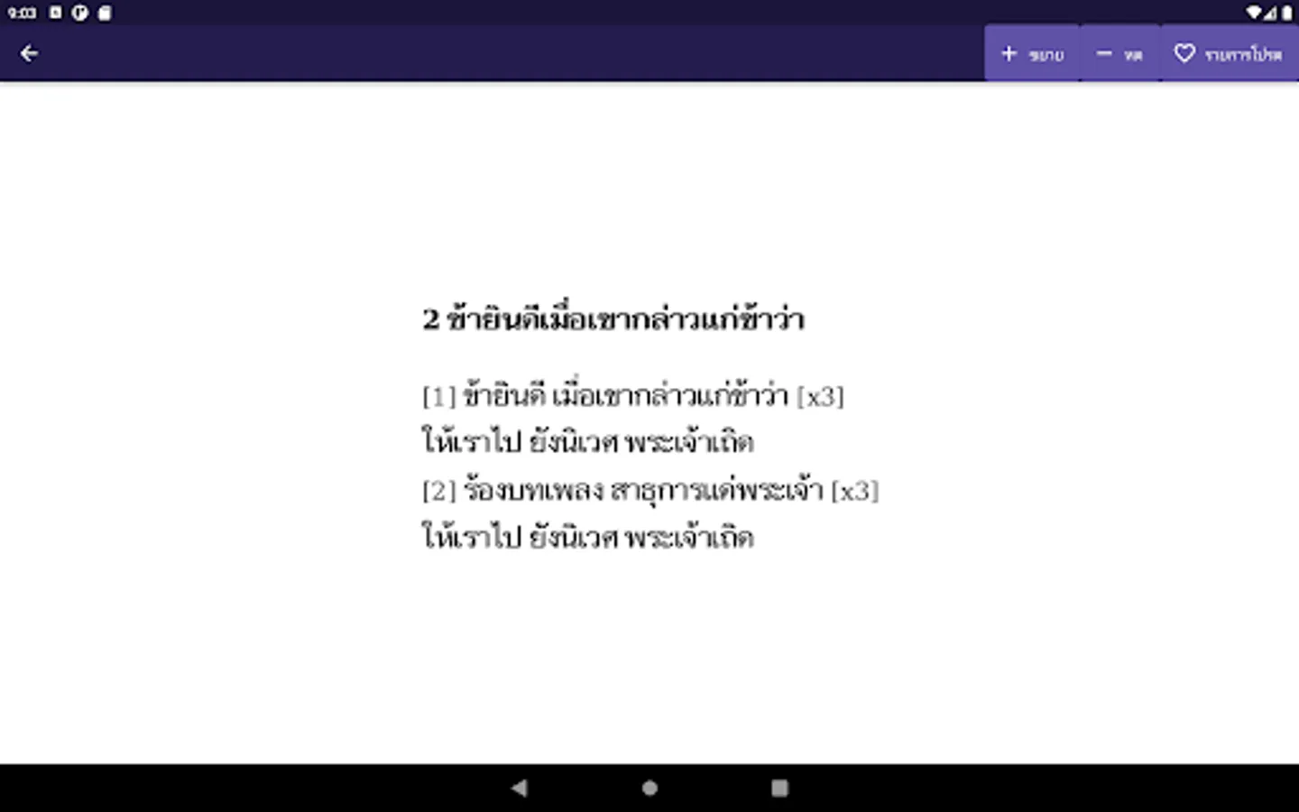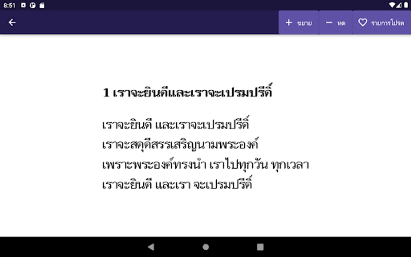 Have you had this? You are meeting together in a small group or at a prayer meeting, and you want to worship together in song, but you have no projector or big screen. But you all do have your phones! This app lets you pick from hundreds of Thai Christian songs and display them, making it easy to sing the same lyrics, without needing to share a URL, a document or an image. Favorite songs can be marked and easily found back. This is a simple app that just does what it says. No advertisements!