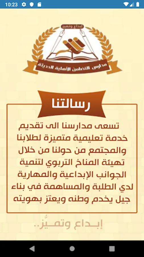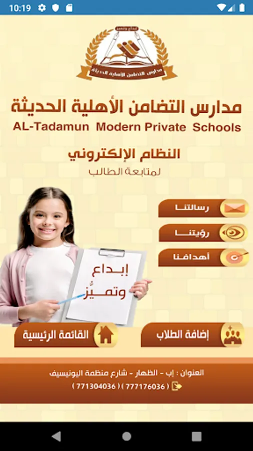 Within the framework of the school administration’s endeavor towards excellence and keeping pace with the rapid development of modern technology that the world is witnessing today and in order to provide distinguished educational and educational services for our students ’students and to facilitate communication with parents, the school administration has developed this application to be the link between the school and the home in order to follow our students’ children and participate in upgrading their level Scientific and educational in order to achieve the goals set in instilling noble values and contribute to the graduation of a generation loaded with science and creation, beneficial to himself and elevated in his homeland